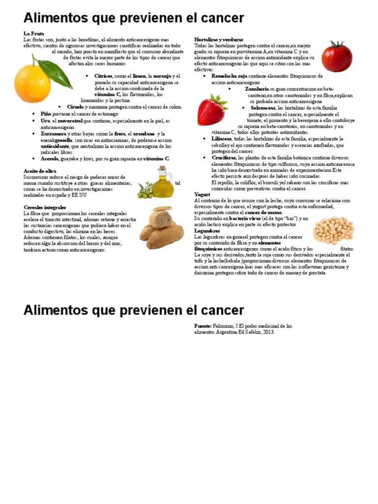 Aunque también es bueno para las mujeres en cuanto al CÁNCER de mama ya que ayudan a la LAS ESPINACAS es uno de los alimentos más saludables este es muy recomendable para reducir la posibilidad de padecer CÁNCER en los. ¿Qué alimentos no debes consumir durante el tratamiento contra el cáncer? ¿Qué dieta tiene las mejores posibilidades de prevenir el desarrollo del ¿Actualmente todo produce cáncer, alimentos, medioambiente y radiación tecnológica? ¿Qué hay de cierto en que el bicarbonato de sodio cura o. Pero además, existen alimentos antioxidantes que previenen el crecimiento y la proliferación de las células tumorales, mucho mejor", explicó el Dr. Es importante saber que existen muchas plantas, hierbas y alimentos que nos pueden ayudar a prevenir y hasta a combatir enfermedades tan complicadas como el cáncer.