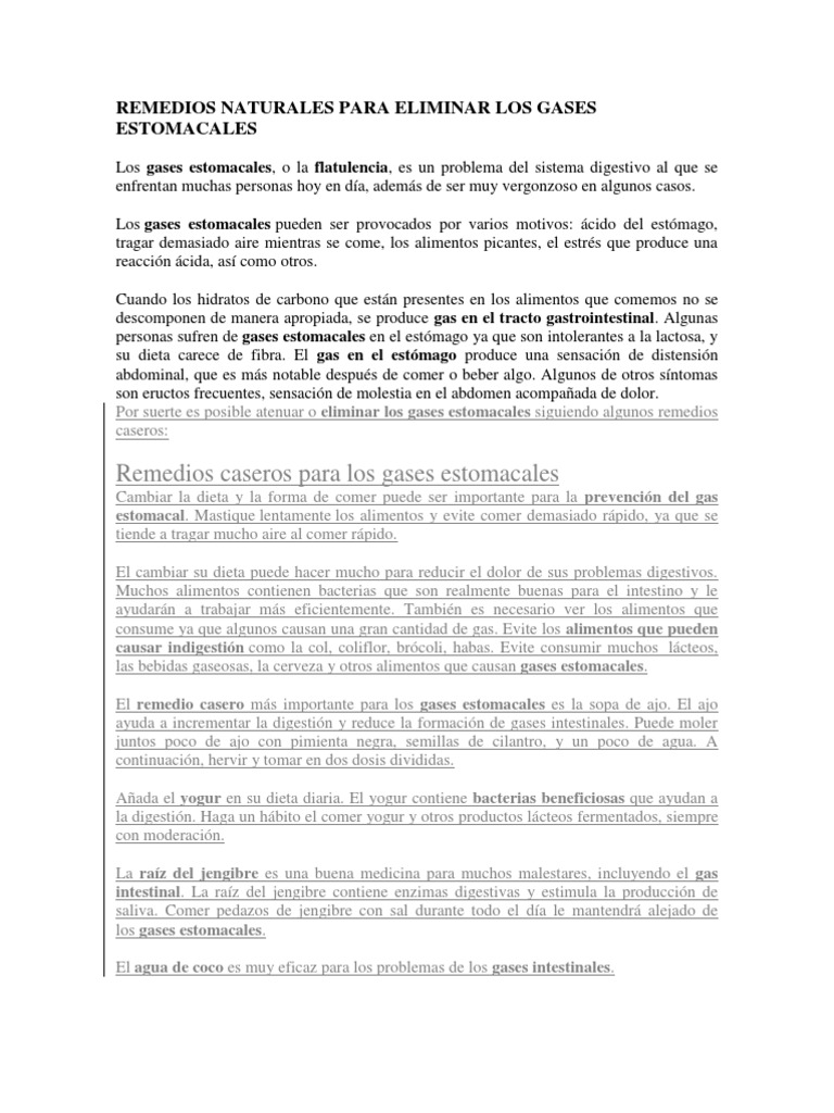 Comer alimentos que combaten los gases y que no provocan flatulencia te ayudará. El gas intestinal se elimina principalmente mediante distintos mecanismos Tratamiento para los gases intestinales. Medicamentos y remedios naturales para evitar esta molestia tan común.