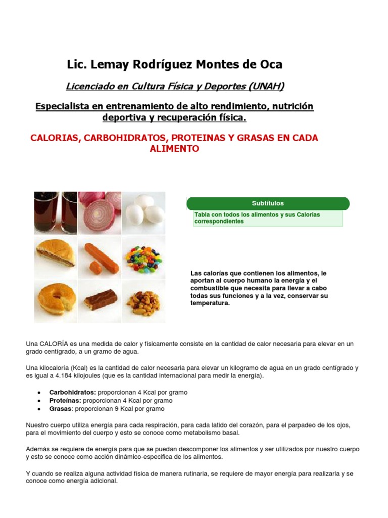 Alimentos Con Sus Proteinas, Hc, Lipidos y Calorias | Caloría | Nutrición deportiva