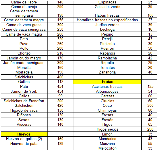 Tabla de calorias en alimentos