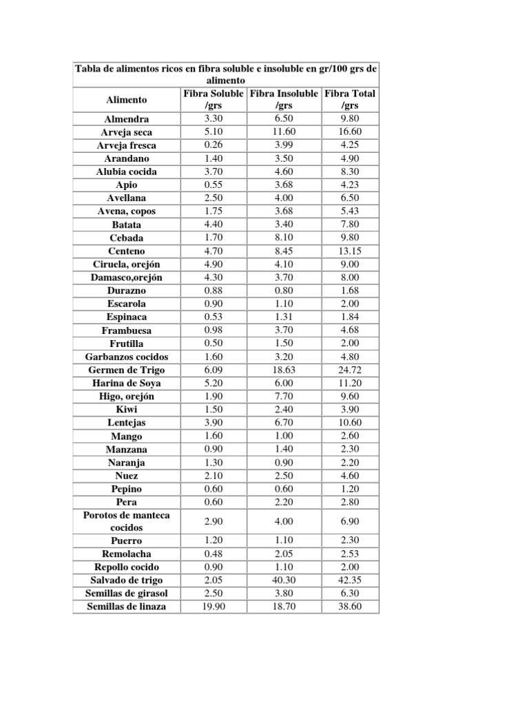 Tabla de Alimentos Ricos en Fibra Soluble e Insoluble en Gr