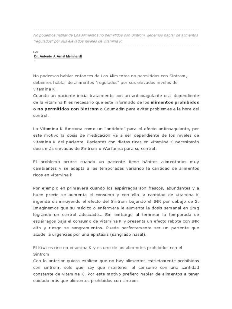 Desde la alimentación se pueden tratar diferentes patologías, como por ejemplo problemas relacionados con la coagulación. La siguiente lista muestra los alimentos con mayor cantidad de vitamina K ordenados de mayor a menor por cantidad de este nutriente Contraindicaciones y alimentos prohibidos del Sintrom. El Sintrom es uno de los anticoagulantes más usados.