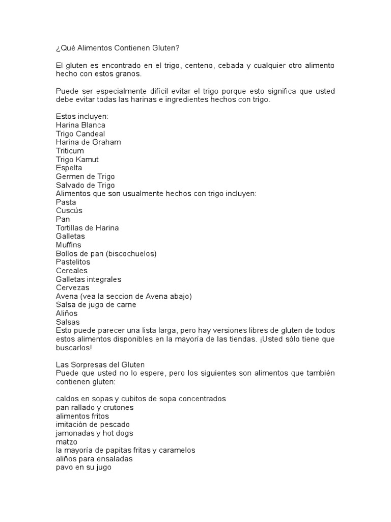 El gluten es encontrado en el trigo, centeno, cebada y cualquier otro alimento. hecho con estos granos.