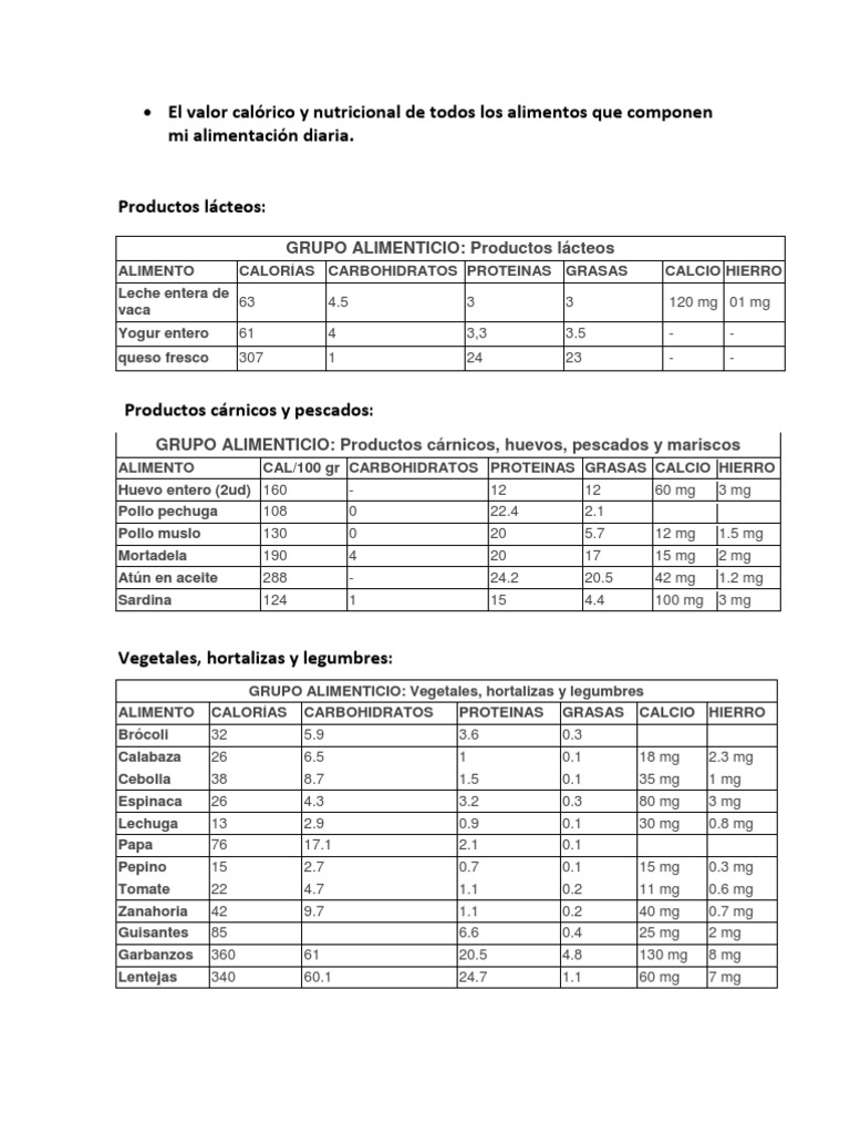 Tablas de Calorias de Los Alimentos Valor Energetico