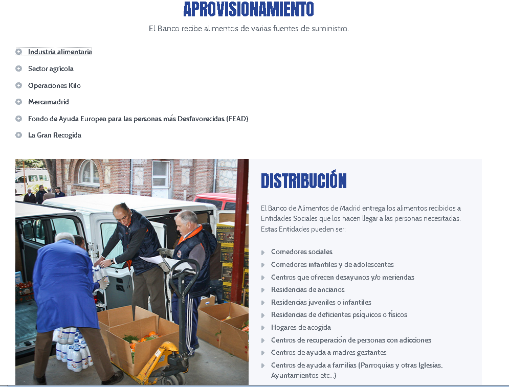 La actividad de las entidades y el sector de la población donde se incluye cada una de las personas determinan la asignación alimentaria de una forma objetiva. Un banco de alimentos es una organización basada en el voluntariado y cuyo objetivo es recuperar alimentos, especialmente no perecederos, de empresas y supermercados, a través de instituciones caritativas y de ayuda social oficialmente reconocidas que tienen el contacto más cercano con los colectivos de personas necesitadas, evitando cualquier desperdicio o mal uso. Galego: Almacén dun Banco de Alimentos.