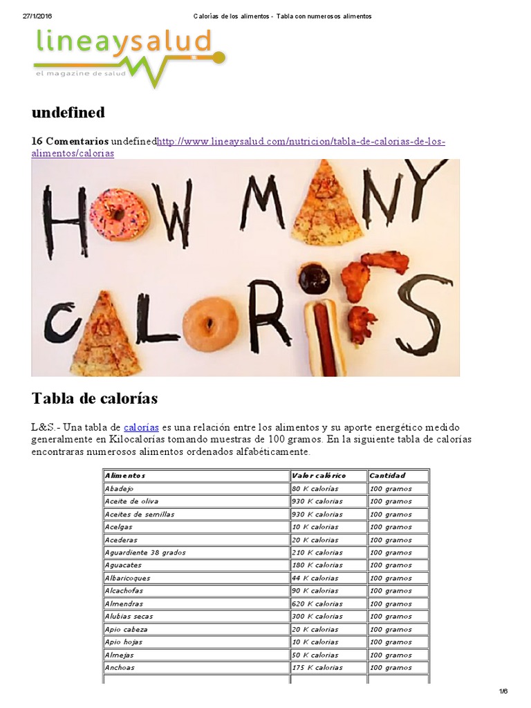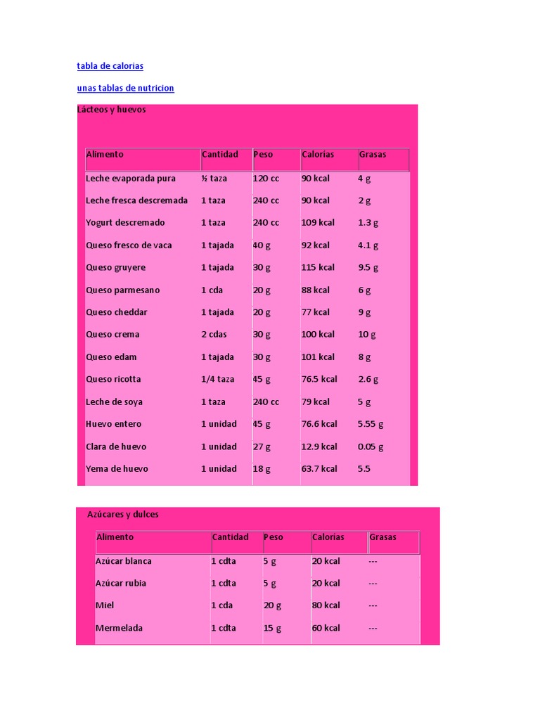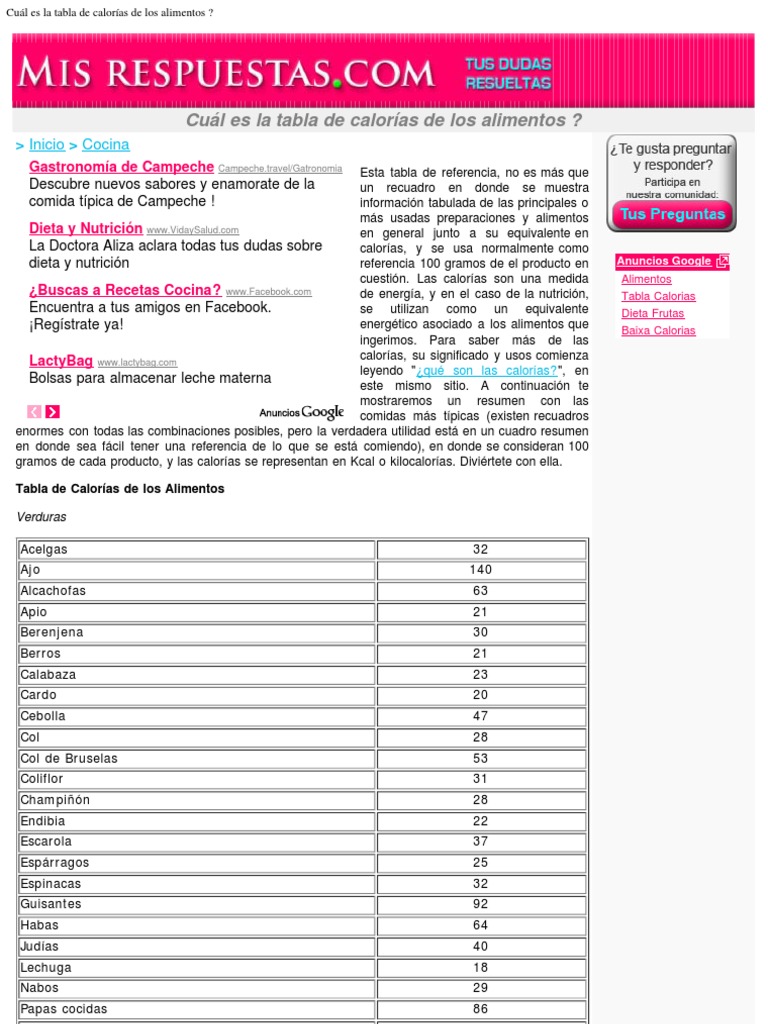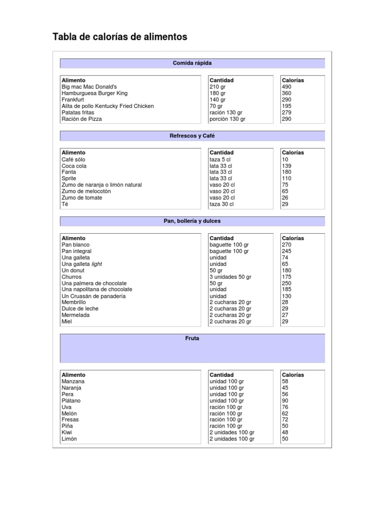 Tabla Calorias | Dieta | Caloría