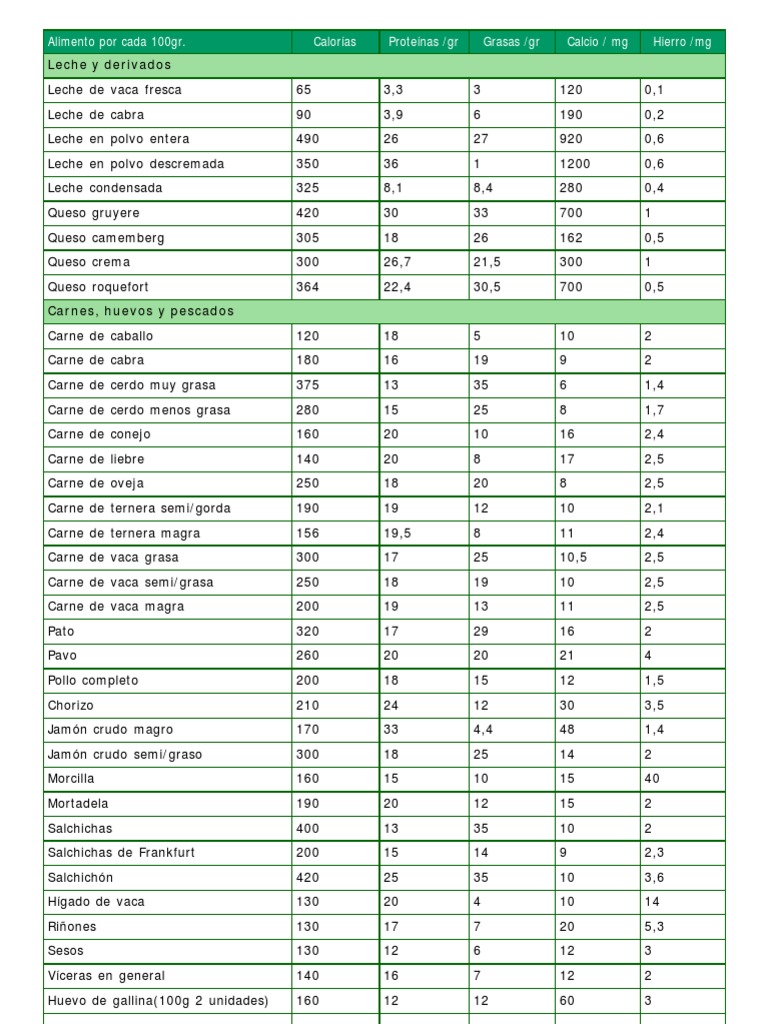 TABLA DE CALORIAS DE ALIMENTOS _ Cálculo de kcal. por cada 100 gr.pdf | Queso | Trigo | Free 30 ...