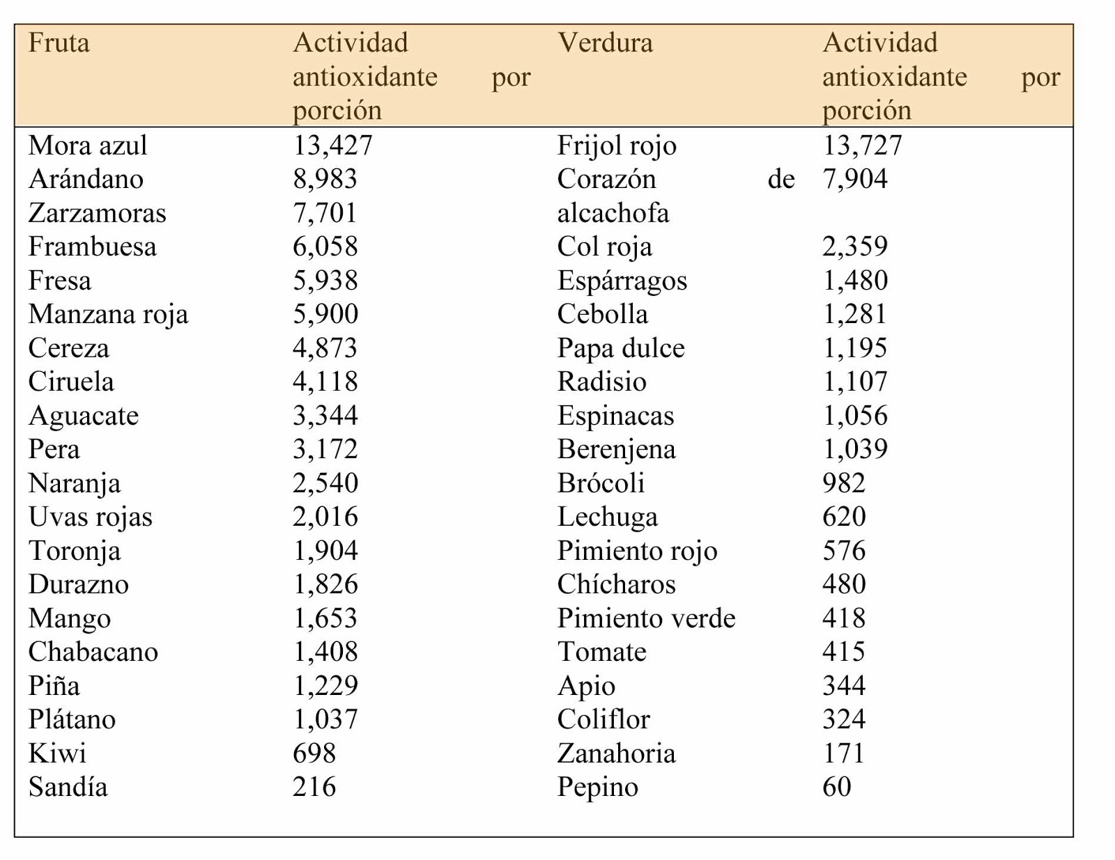 Algunos ejemplos de alimentos ricos en antioxidantes incluyen frutas y vegetales (verduras) que tienen un alto contenido en vitaminas A, C y E, beta carotenos, luteína, licopeno y selenio.