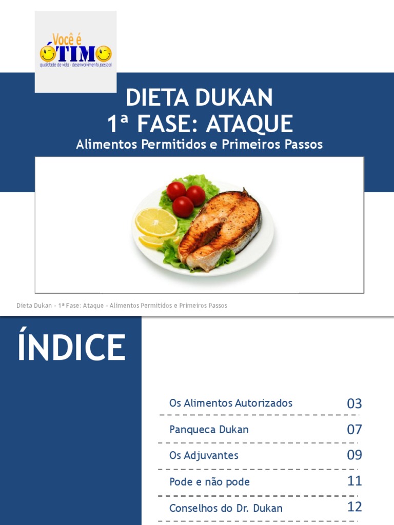Fase Ataque Dukan Alimentos. Os Alimentos Autorizados Durante essa fase voc ter direito a onze categorias de alimentos para se alimentar, apresentados a seguir. Alguns alimentos ideais para a fase ataque da dieta Dukan.