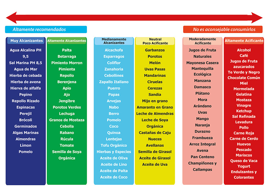 Si embargo hay alimentos que al descomponerse en el cuerpo nos aporta un contenido. En general, comer en exceso y la actividad física y mental producen sustancias ligeramente acidificantes del organismo, por lo que los alimentos basificantes no pueden. Aumentar el consumo de alimentos alcalinizantes.